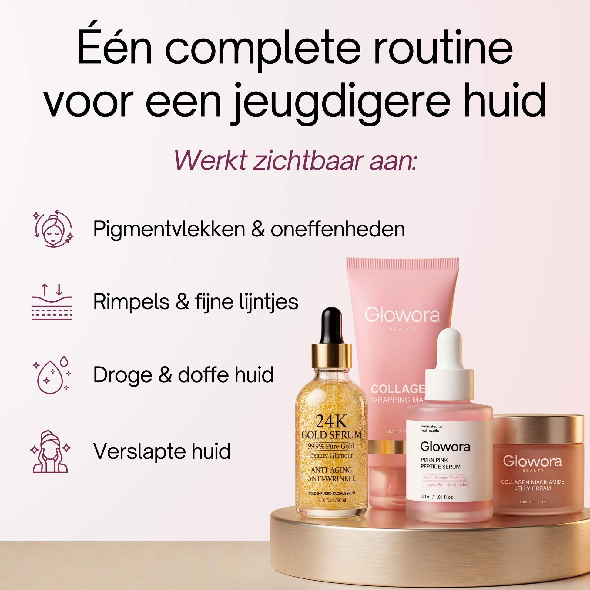 Morgens & abends: Beginne mit 2–3 Tropfen PDRN-Serum, sanft einklopfen und einziehen lassen. Anschließend 3–4 Tropfen 24K Gold Serum auftragen und leicht einmassieren. Zum Abschluss eine kleine Menge Niacinamid Jelly Creme auf Gesicht und Hals auftragen.